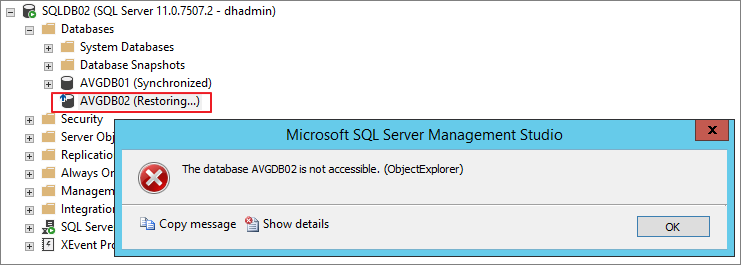 1. Always-on 가용성 그룹 구성 후, Secondary (SQLDB02)에서 Database가 Restoring... 으로 표시되고, 대상 DB를 클릭하면 아래와 같은 오류가 발생함