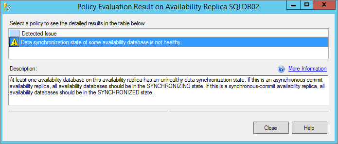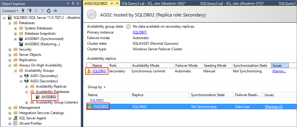 2. Secondary에서 Availability Group - Availability Databases 에 경고가 표시되고, Dashboard에서도 아래와 같은 경고가 표시됨.