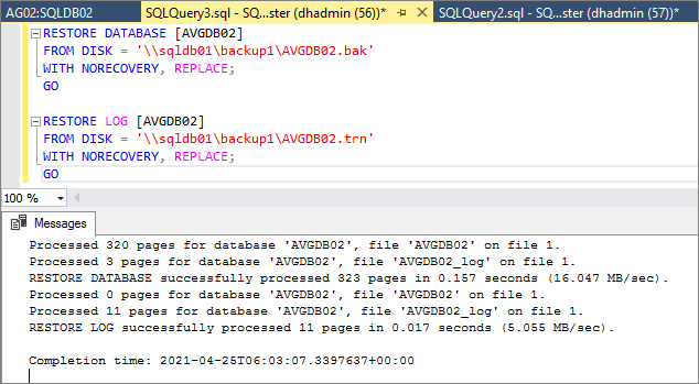 3. Secondary에서 DB와 Log 복원 (NORECOVERY 옵션 사용)