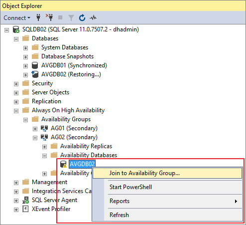 Secondary의 Availability Group - Availability Databases에서 대상 Database를 오른쪽 클릭 후 'Join th Availability Group'을 선택합니다.