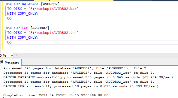1. Primary에서 DB와 Log를 백업 (COPY_ONLY 옵션 사용)