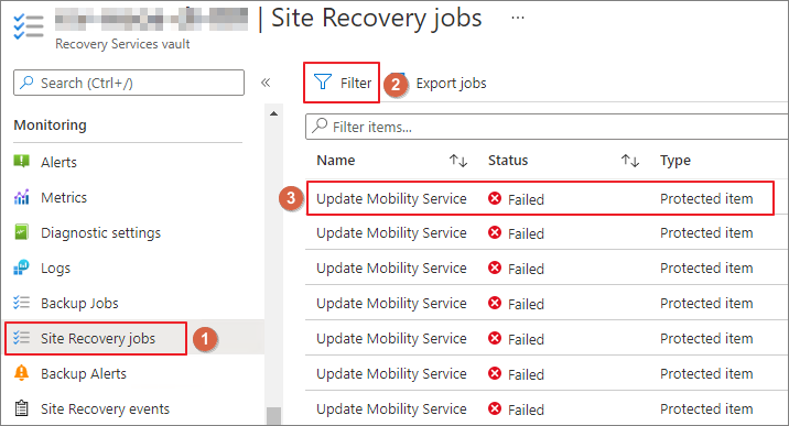 Recovery Service Vault의 Site Recovery jobs에서 Filter를 클릭하고 검색 기간을 최대 90일 전으로 지정한 후 검색하여