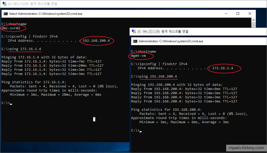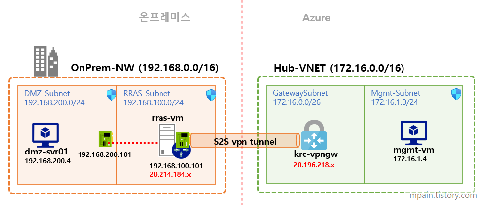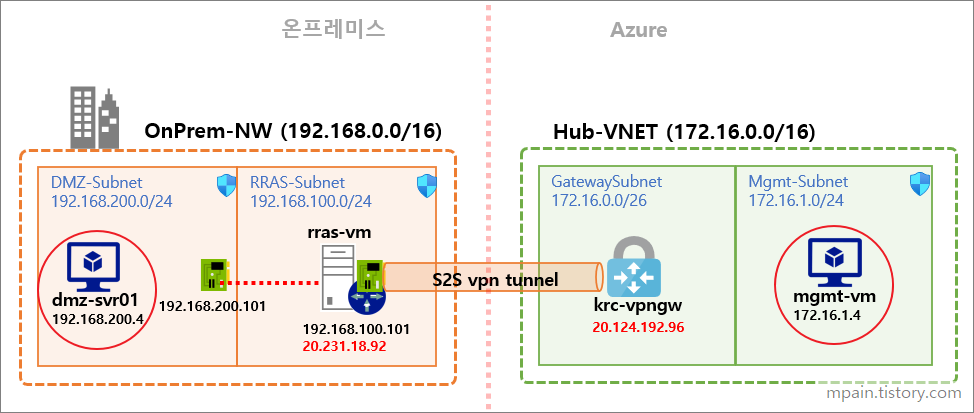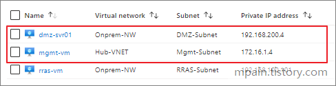 테스트 환경 구성이 완료되면 온프레미스의 dmz-svr01과 Azure의 mgmt-vm간에 private ip 주소로 통신이 가능해집니다.