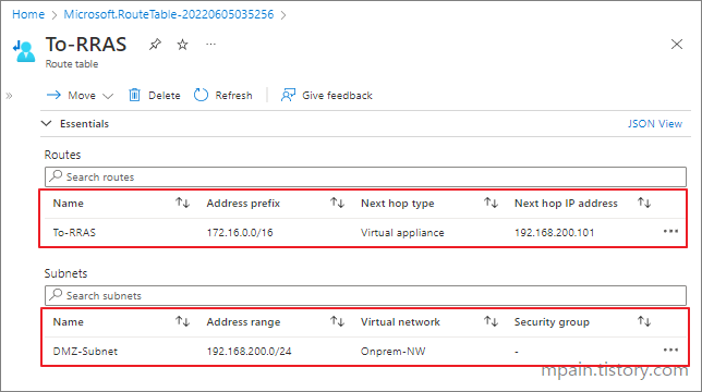온프레미스(OnPrem-NW)에서 Azure Virtual network(Hub-VNET)의 IP 대역으로 나가는 트래픽이 RRAS를 통과하도록 하기위해 UDR을 사용합니다.