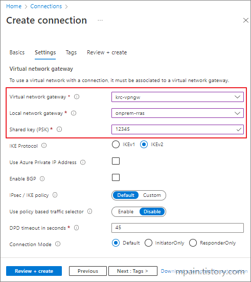 Virtual network gateway, Local network gateway, Shared key(PSK)를 지정합니다.