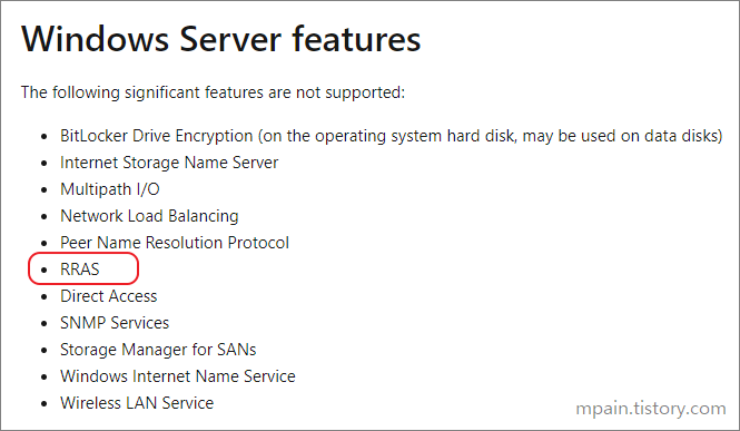 | *중요 Microsoft는 Azure 의 Windows Server 가상 머신에서의 RRAS 사용을 공식적으로는 지원하지 않습니다. https://support.microsoft.com/en-us/help/2721672/microsoft-server-software-support-for-microsoft-azure-virtual-machines ![]() 따라서, Azure에서는 테스트 용도로만 RRAS를 사용해야 합니다. Azure에서 RRAS를 사용하다가 문제가 생기더라도 Microsoft로부터 지원을 받을 수 없습니다. |