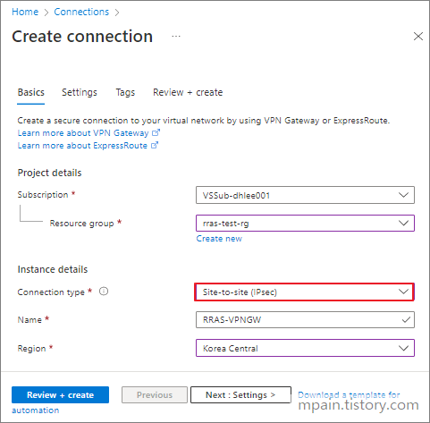 Connection 리소스를 생성할 때, Connection type은 Site-to-site (IPsec)을 선택합니다.