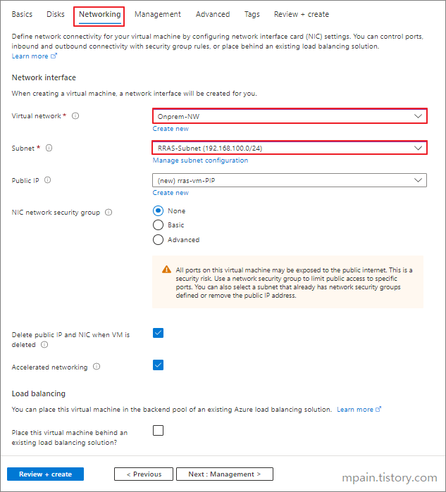 *Source는 VPN Gateway의 Public IP 주소, Destination은 RRAS VM의 첫 번째 NIC의 Private IP 주소