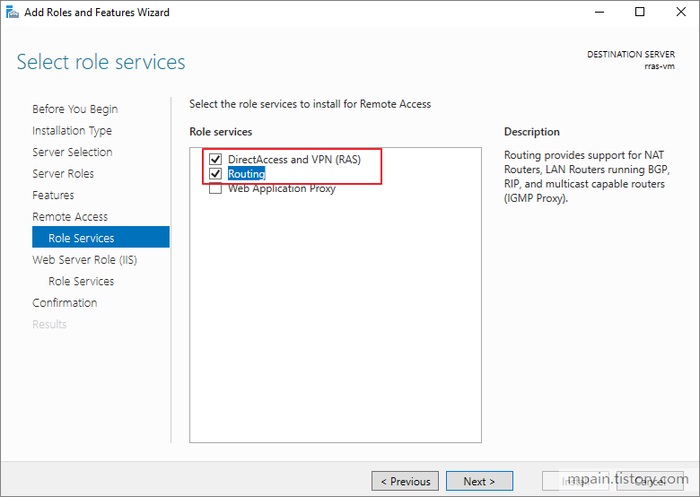 Role Services에서 DirectAccess and VPN (RAS), Routing을 선택합니다.