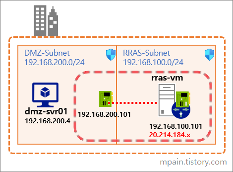 왼쪽의 Virtual Network를 온프레미스 네트워크라고 가정하고, rras-vm을 VPN 장비처럼 동작하도록 구성하는 방법을 소개할 예정입니다.