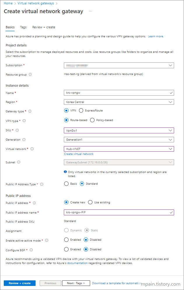 Virtual network와 Subnet은 아래와 동일하게 설정합니다.