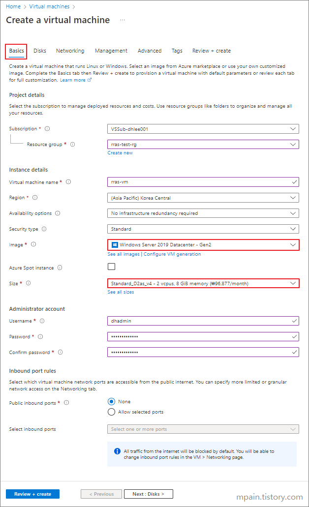 Windows Server 2019 VM을 생성합니다.