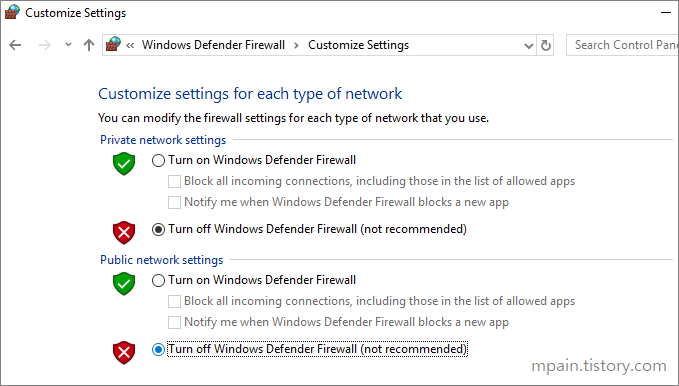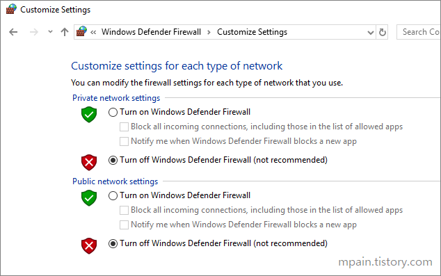 테스트를 위해 VM의 Windows 방화벽은 중지합니다.