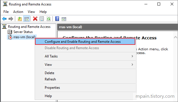 RRAS VM을 오른쪽 버튼 클릭하고 'Configure and Enable Routing and Remote Access'를 클릭합니다.