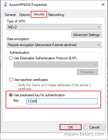 - Use preshared key for authentication - Preshared key 입력 ('12345')