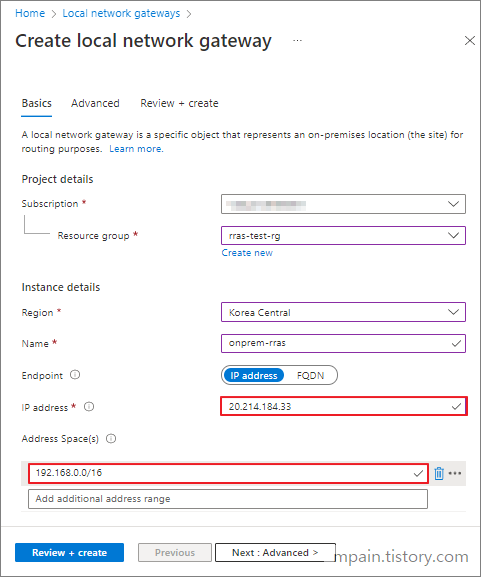 Address Space에는 온프레미스 IP 대역을 입력합니다. (192.168.0.0/16)