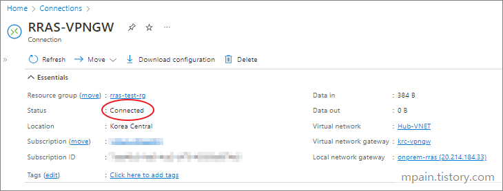 VPN Gateway Connection 리소스를 확인해보면, Status가 Connected로 표시됩니다.