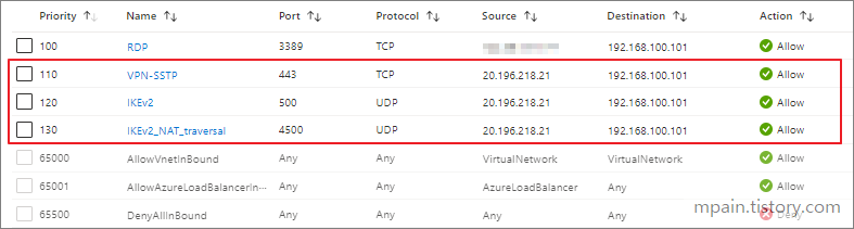 VPN Gateway와 S2S VPN 연결을 위해, RRAS VM의 NSG의 Inbound 규칙에 아래의 Port들을 허용으로 추가합니다.