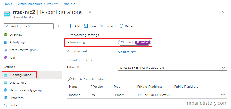 두 번째 NIC의 IP configurations 메뉴에서 IP forwarding을 Enabled로 변경합니다.